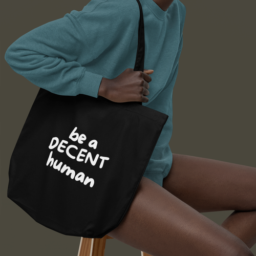 Be a Decent Human Tote Bag | Black Canvas Statement Tote | Ethical Activism Bag | Kindness & Humanity Quote Reusable Shopping Bag